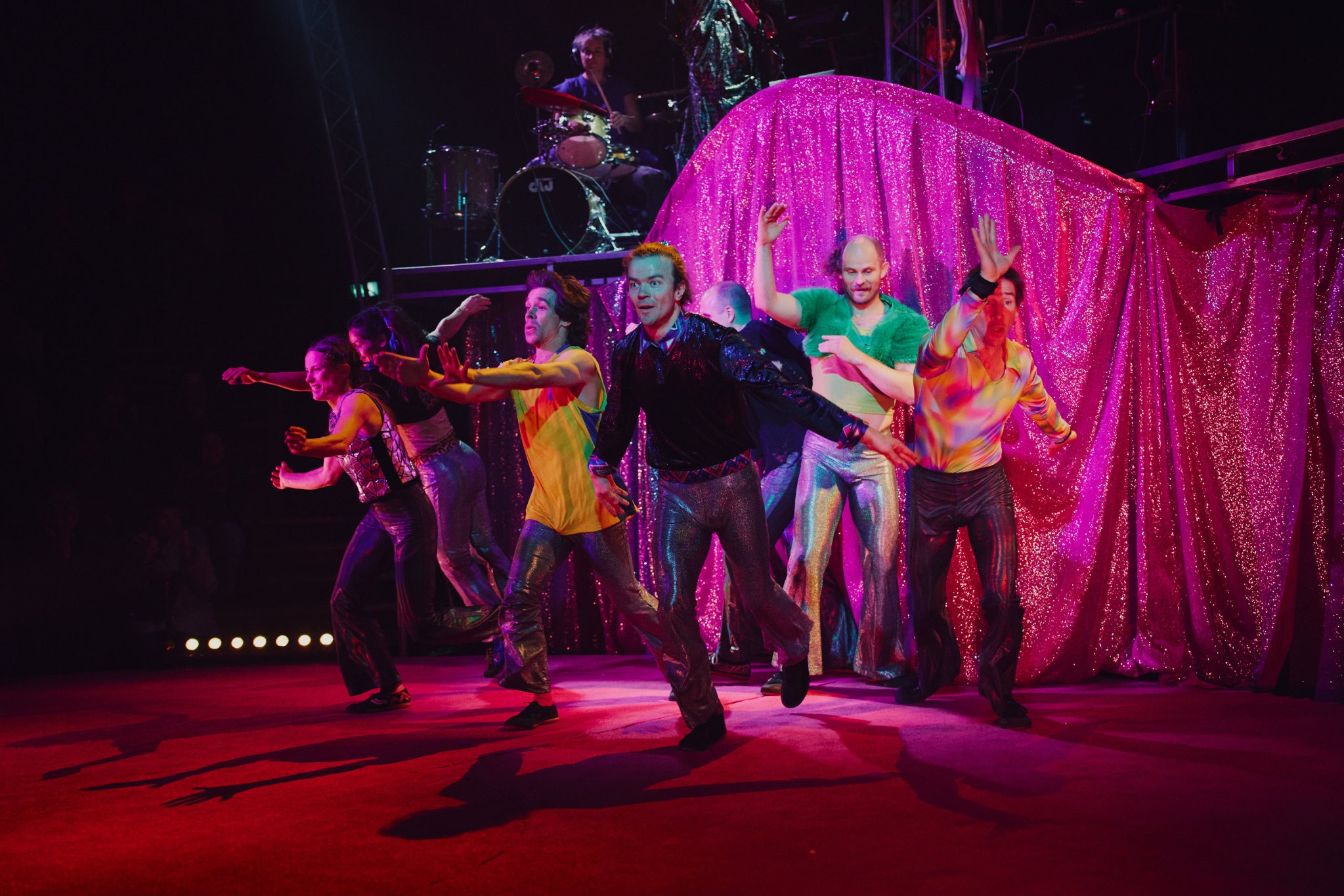 På programmet: klubbjonglering, gungtrapets, Raskhjul, perche, magi, kollektiva akrobatiknummer, lina, skywalk, rullskridskor, aerial straps och gungbräda – allt buren av de vilda rytmerna från ett elektro-rock-brass-band.